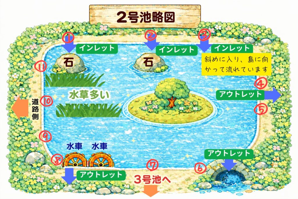 2号池の道路側の①、⑪インレット周りの魚影がズバ抜けて濃くなっていました