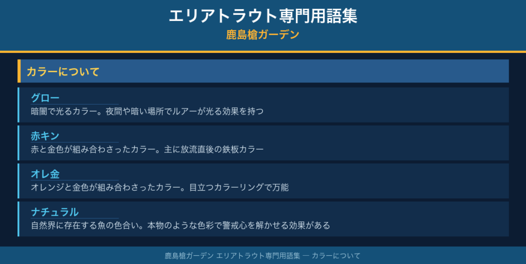 暗闇で光るカラーのことです、夜間や暗い場所でルアーが光る効果を持っています